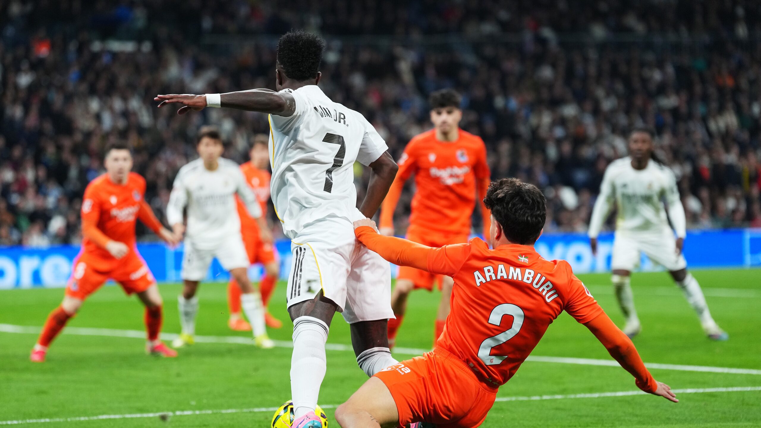 واحتسب الحكم ركلتي جزاء لريال مدريد، تحولتا إلى هدفين ضمن رباعية الفريق الملكي، المثير أن الركلتين احتسبتا ضد جون أرامبورو، لاعب ريال سوسيداد، بعد احتكاكه مع فينيسيوس، وفي كل مرة نفذ النجم البرازيلي الركلة بنفسه.