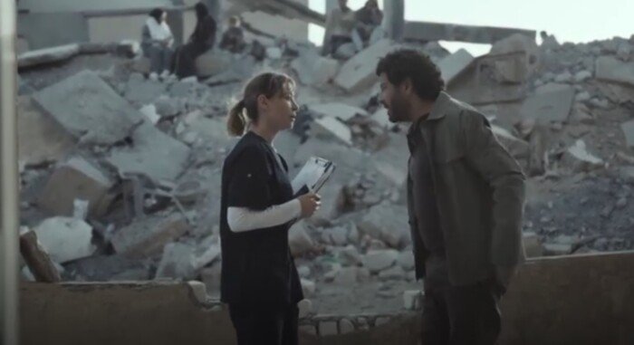 وفي المقابل، يقدم إياد نصار شخصية رجل فلسطيني يعيش صراعا وجوديا تحت وطأة القصف، ويسعى لإنقاذ ابن شقيقه من الموت، وتتقاطع رحلة الطبيبة المصرية مع مسار الرجل الفلسطيني، لتتشكل بينهما علاقة إنسانية عميقة.