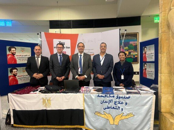 معرض صندوق مكافحة وعلاج الإدمان والتعاطي داخل مقر الأمم المتحدة في فيينا. ومن خلال هذا المعرض يتم شرح أساليب عمل مراكز العزم التابعة للصندوق، حيث تقدم العلاج والتأهيل لمرضى الإدمان مجاناً ووفق المعايير العالمية، وكذلك برامج التنمية الاقتصادية للمتعافين من خلال تعليمهم المهارات التي يحتاجها سوق العمل ضمن الخدمات المجانية بعد العلاج الطبي، لتصبح المعرفة بإنشاء مراكز العزم رائدة مستدامة. جوانب تنفيذ استراتيجية مصر لمكافحة المخدرات والحد من مخاطر العنف والإدمان. ما تم إنشاؤه بقيادة الرئيس عبد الفتاح السيسي رئيس جمهورية مصر العربية، ويتم استخدامه بالتعاون مع الوزارات والجهات المعنية، بالإضافة إلى تنفيذ برنامج الحماية من المخدرات في المناطق المتقدمة “بدلاً من العيش في القرى”، وذلك وفقاً لتكليف رئيس الجمهورية بإنشاء برامج الحماية من المخدرات في المناطق السكنية الجديدة. كما يتم تنفيذ برامج مختلفة للوقاية من الأمراض لرفع مستوى الوعي حول مخاطر العنف.