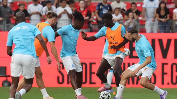 لاعبو مرسيليا خلال عمليات الإحماء قبل مباراة رين، 15 أغسطس 2025 (فريد تانو/فرانس برس)