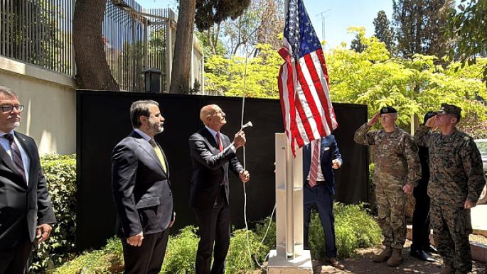 الشيباني وبرّاك أمام مقر السفير الأميركي في دمشق، 29 مايو 2025 (فرانس برس)
