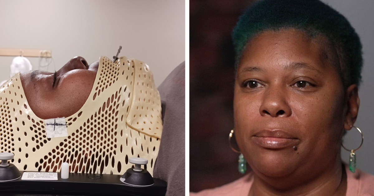 Robin Phillip during a radiation session in 2024. A mask holds her head in place for the treatment.Courtesy Robin Phillip