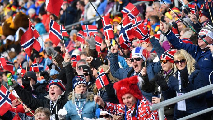 مشجعون للنرويج يلوحون بعلم بلادهم في إيطاليا، 13 فبراير 2020 (تيزيانا فابي/فرانس برس)